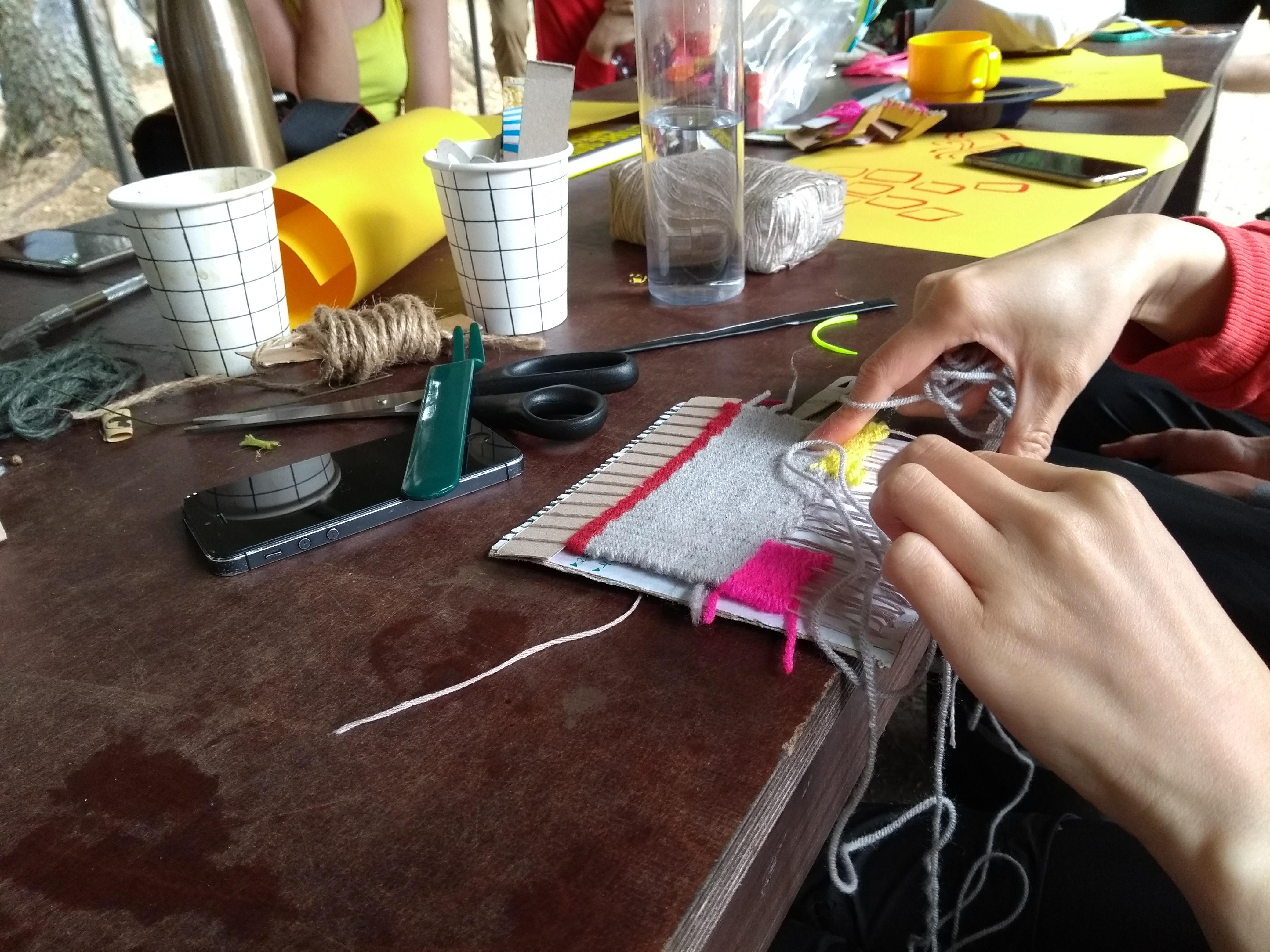 My workshop incorporated discussions from previous workshops, reading circles, and sauna talks. It was held on the top of a large rock that faced the sea and had the best view I found in the Island. All the materials were upcycled (aka trash), locally sourced from the island or cost very little. I opened the discussion by talking about the struggles of sourcing the materials and the labor-intensive process of hand-making each loom and tools for 20 people. From my almost silly struggles, we had conversations about weaving and its relation to female labor and culture, craft business as a tool for female empowerment, the implicit values of things we buy and our tendency to ignore them. Most participants continued working on their weavings during the rest of the week, taught each other weaving tricks and continued discussions related to value and meaning in buying commercial products.